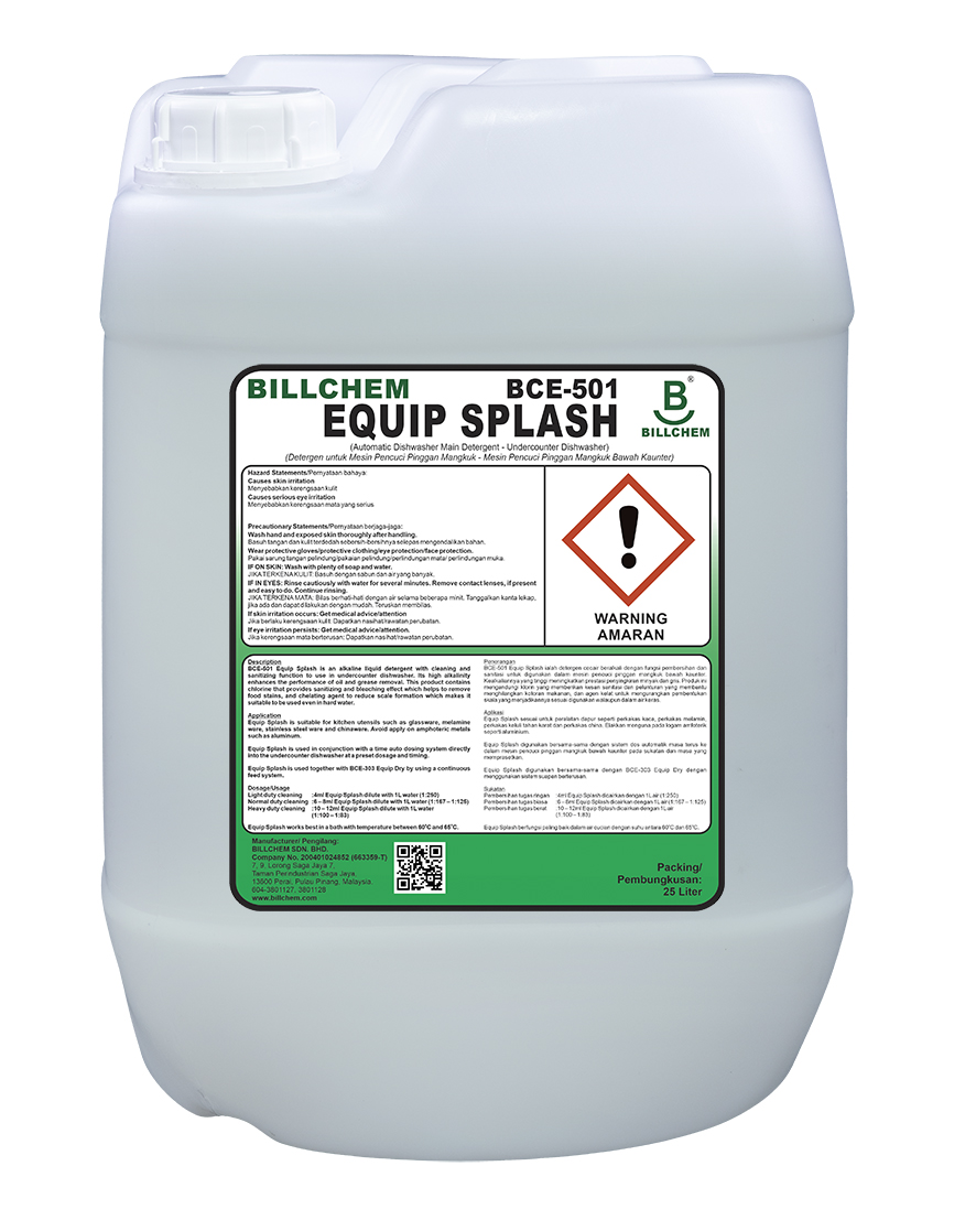 BCE-501 Equip Splash is an alkaline liquid detergent with cleaning and sanitizing function to use in undercounter dishwasher. Its high alkalinity enhances the performance of oil and grease removal. This product contains chlorine that provides sanitizing and bleaching effect which helps to remove food stains, and chelating agent to reduce scale formation which makes it suitable to be used even in hard water.