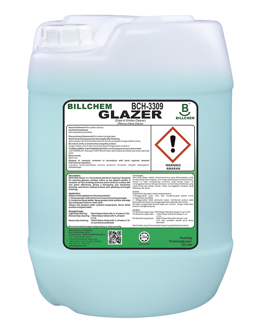 BCH-3309 Glazer is a formulated petroleum hydroxyl designed for cleaning glasses, window, mirror or any glazed surfaces. It contains no foul smelling ammonia and it removes surface dirt and grime effectively, giving a fast-drying and streak-free cleaning, and leaves cleaned surface with sparkling and bright finishing.