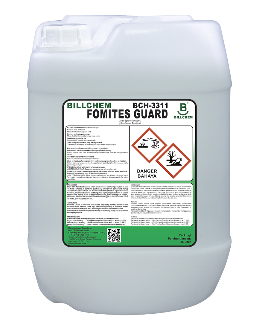 BCH-3311 Fomites Guard is a non-alcohol base sanitizing solution to use on hard surfaces. It contains quaternary ammonium compound (QAC) and chlorhexidine which are disinfectants that effective against various bacteria, enveloped viruses and fungi. It is highly recommended to use in restaurants, hotels, malls or department stores, clinic or hospital, airport, factories, warehouse, office to sanitize all type of hard surfaces such as metal, plastic, glass etc. The fruity peach fragrance leaves sanitized surfaces with pleasant and refreshing scent.