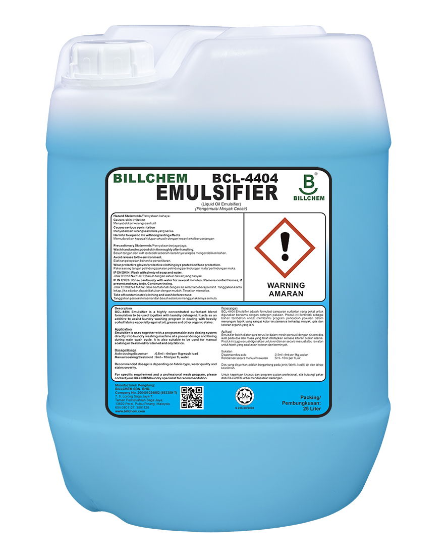 BCL-4404 Emulsifier is a high concentrated surfactant blend formulation to be used together with laundry detergent. It acts as an additive to assist laundry washing program in dealing with heavily soiled fabrics especially against oil, grease and other organic stains.